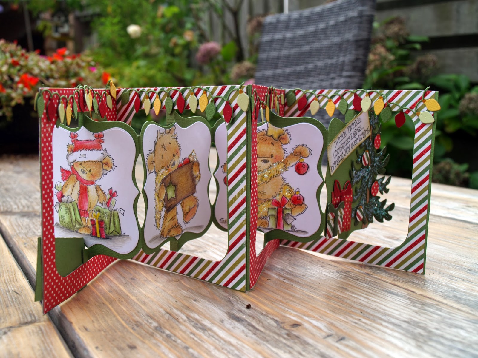 I made this harmonica card a while ago. I used the fabulous Sizzix Accordion die. Also stamps from Lily of the Valley, coloured with my faber castell pencils, cc cutter die for the lights. The presents and the tree are Leabilities. The text I made with stamps from The Stamps of Life.